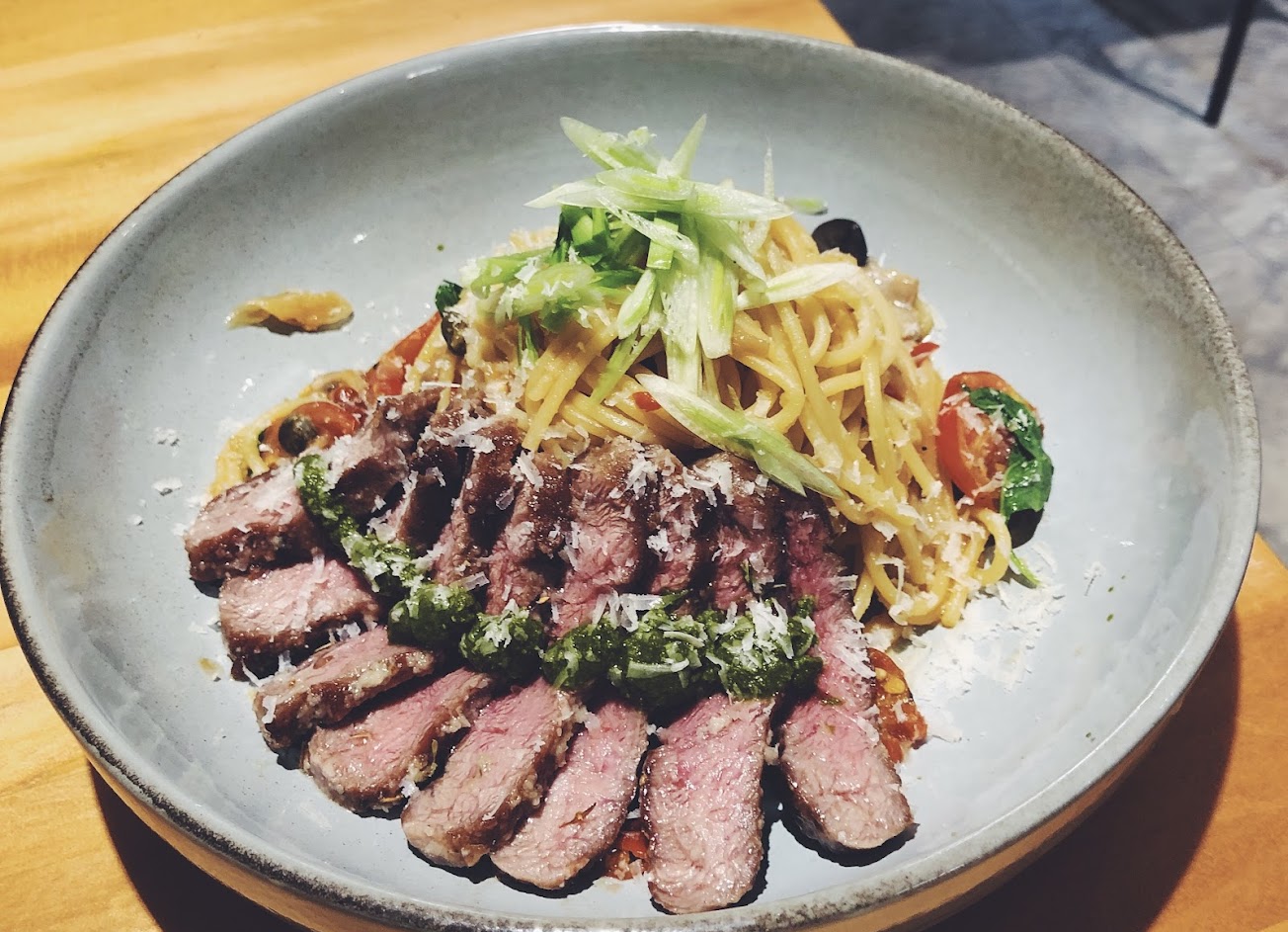 5.煙花女義大利麵,坐在吧台的位置看著廚師們忙忙碌碌,聞到那大火爆炒、烹煮、沙拉併發出了香氣,滿足了自己的感官,感受著廚師們為了煙花女忙碌的身影,些微青醬點綴5分熟的牛排搭配上清炒的義大利麵,爽口的味道完美的解決了肉類帶來的油膩感,但是當天的我本人對於麵沒有很多想法,就不加以稱讚了。