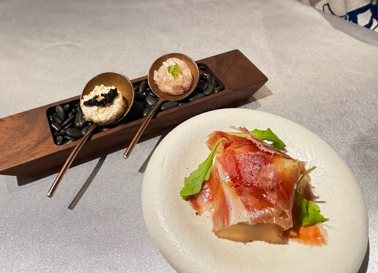 當天選了雙人套餐 開胃菜生蠔很新鮮沒有腥味~松露濃湯我很喜歡!味道很濃郁口味偏重但不會膩 感覺很適合沾麵包吃 鮑魚有驚艷到我!乾冰為視覺效果加分 還會用桃木(?)煙燻過增添香氣 口感跟調味沒話說 吃下去臉上的笑容藏不住 這道很喜歡?主餐的軟殼小龍蝦口感上吃起來比較普通 外殼炸過會跟蝦肉有點分離感 且肉質比較偏軟爛一些 不過和牛很好吃非常軟嫩 還有多種風味的鹽可以作搭配 甜點蘋果派的口感蠻特別的 整體上用餐體驗不錯?