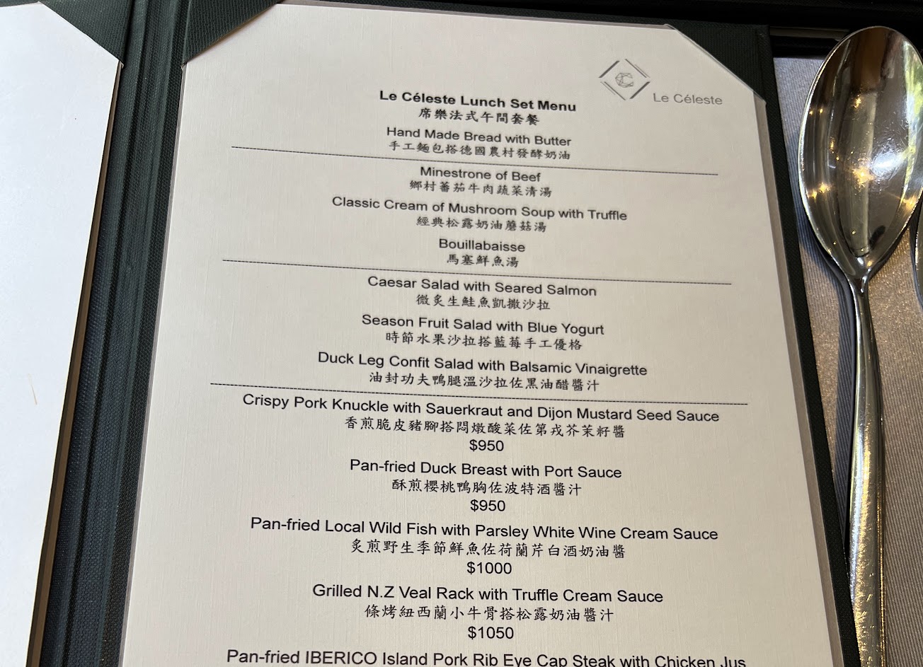 2022/09 商業午餐($950起) 水資($45/人) 炙煎野生鮮魚($1000) 條烤小牛骨($1050)是帶骨的小羔牛 肉質軟嫩但較沒什麼牛味 黑牛肋眼心($1250)
