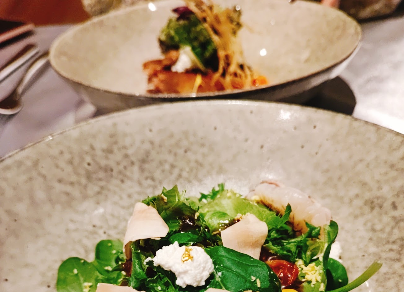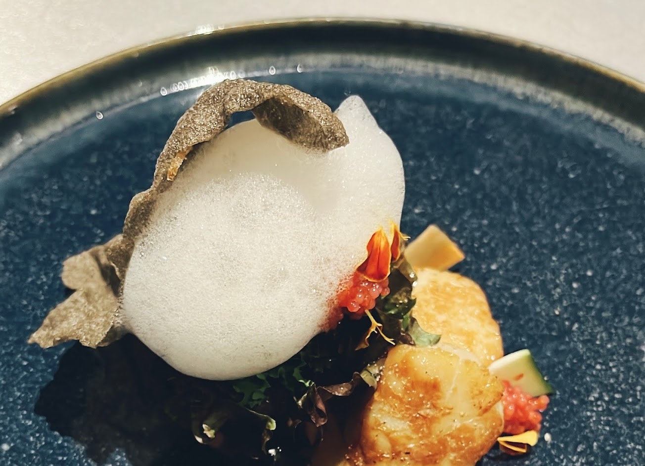 北海道干貝沙拉的生菜的佐醬普通,搭配起來無法提升生菜的美味,會讓人覺得在吃草,上面泡泡是什麼做的不知道(因為服務人員的聲音真的太小聲了,真的聽不清楚)但這個泡泡沒有加分的效果,反倒是讓墨魚酥片整個軟掉變不好吃,但干貝非常鮮嫩好吃
