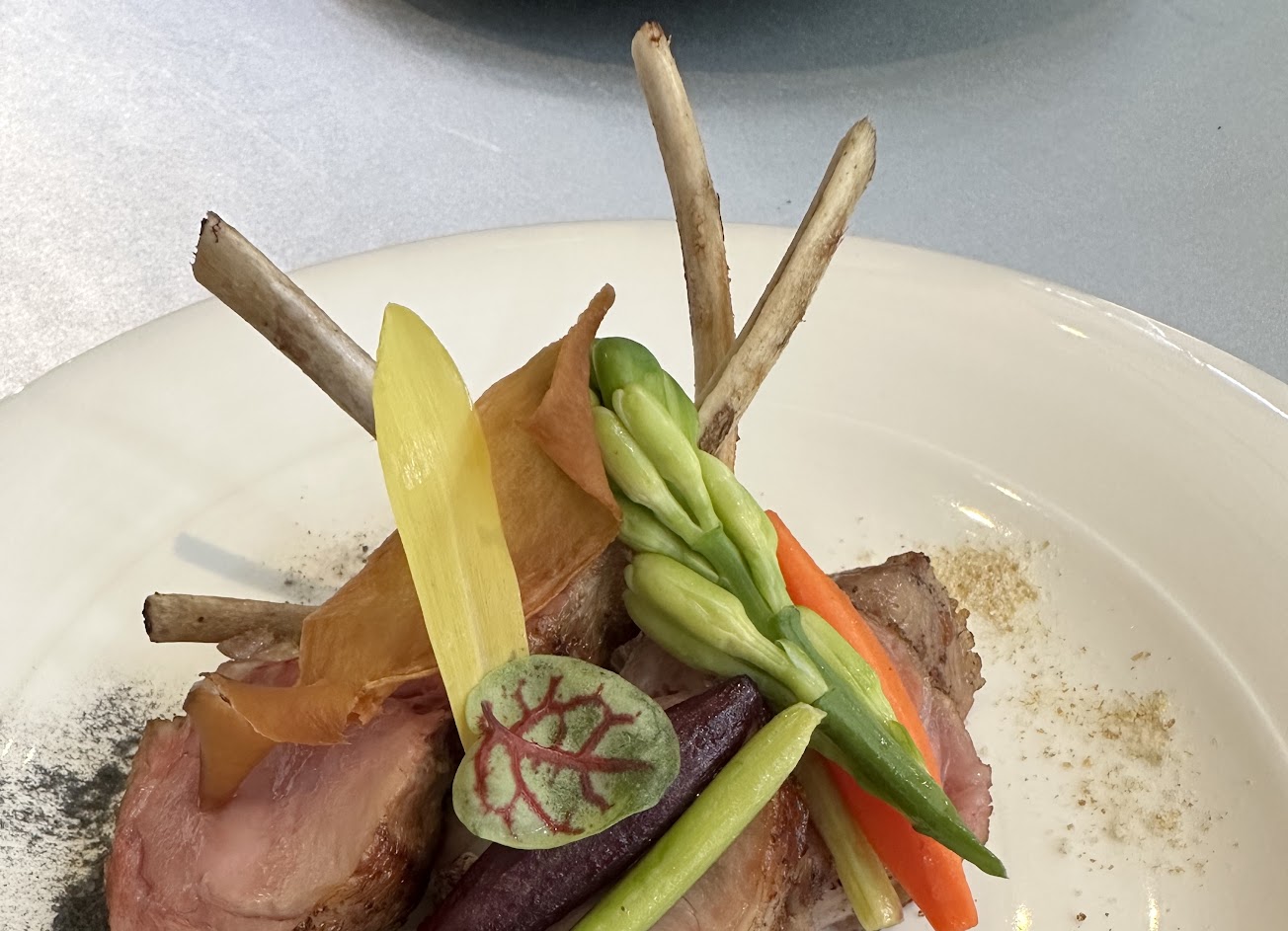 使用90%都可以食用軟殼龍蝦,肉質鮮美加上酥炸風味吃起來很香,配菜有芥藍菜、玉米苗和紫地瓜以及用橙汁肉桂去煮的紅蘿蔔等等,整體食材搭配酸豆番茄奶油醬很好吃?10%也都處理掉了哦!真的連殼都可以安心吃光光的沒問題~