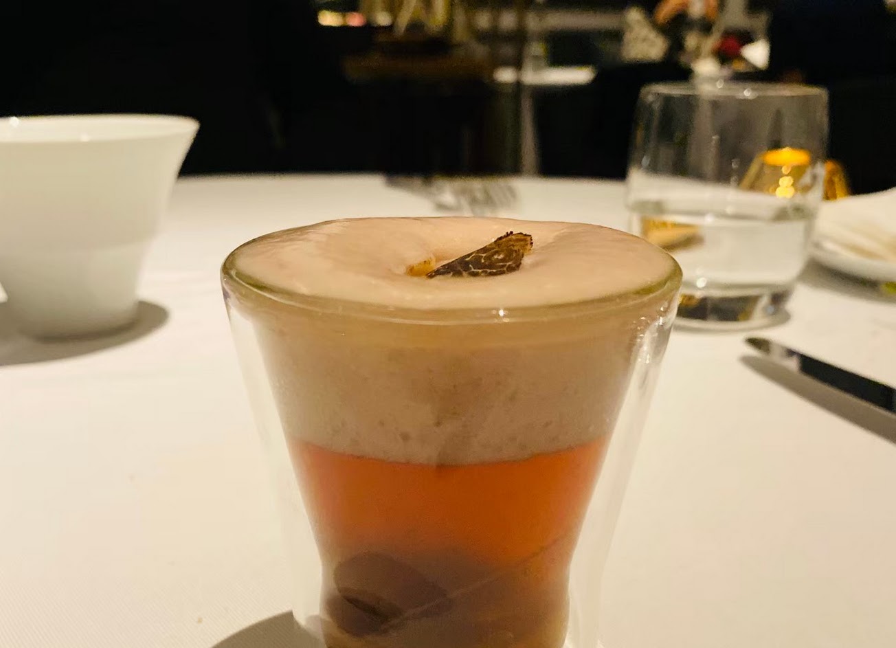 台灣小農彩色蘿蔔湯,牛奶泡泡,法國起司 感覺有用牛骨湯底,味道強烈,蓋住彩色蘿蔔的甜味,全部攪拌在一起沒有做到平衡的狀態,反而互相影響,給人有種模模糊糊的印象。
