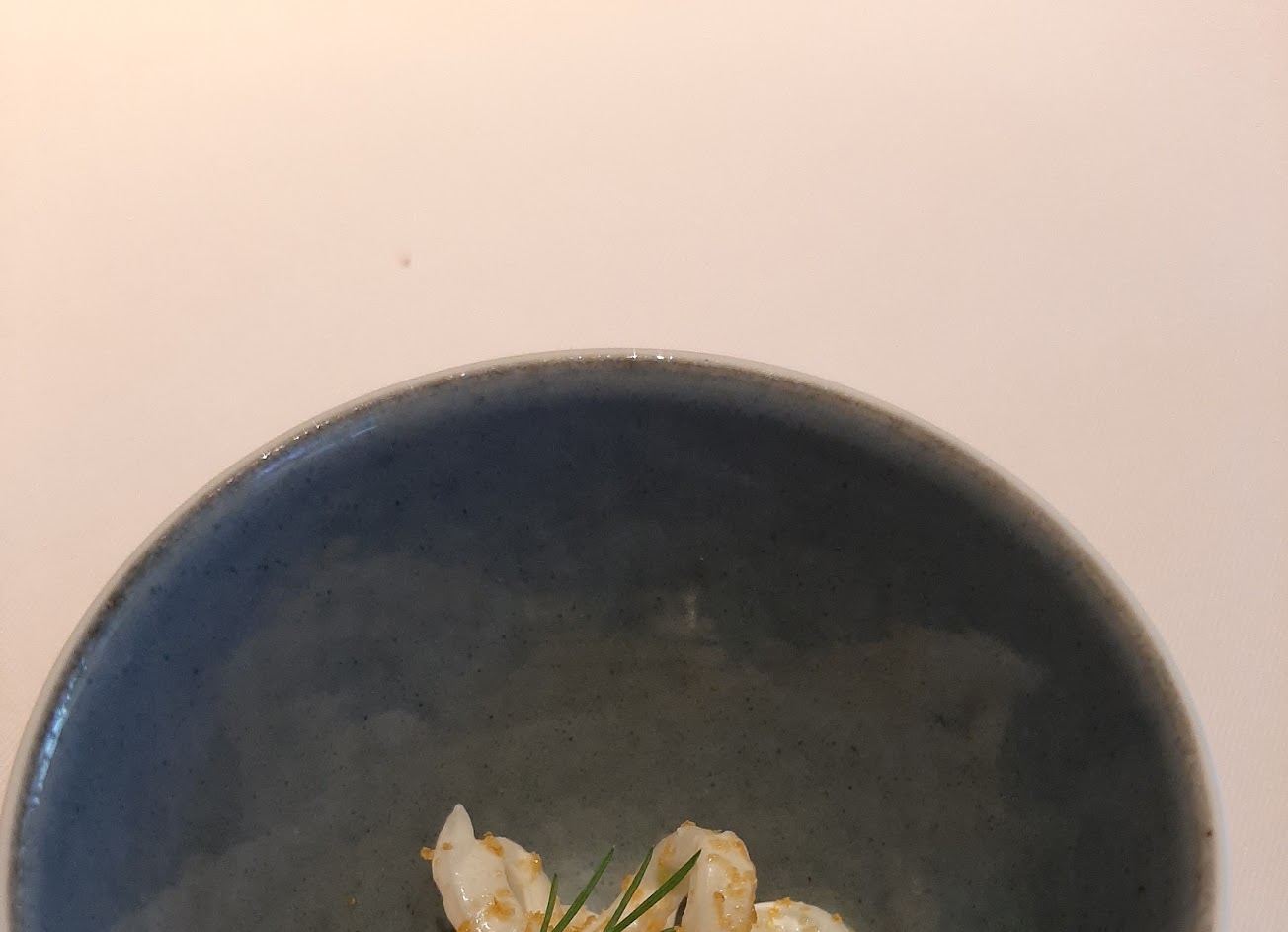 前盤:伊比利火腿有油耗跟肉腥味,蒸蛋上面還好,沒想到吃到底下有魚湯竟就變魚腥味。貽貝咬開是食材本身的鹹沒辦法,但不香,鬼頭刀讓人疑惑在吃什麼,沒香味沒鹹淡還有點腥,魚肉無法吃完,沒想到最好吃的是上面裝飾用干貝做的黑網。