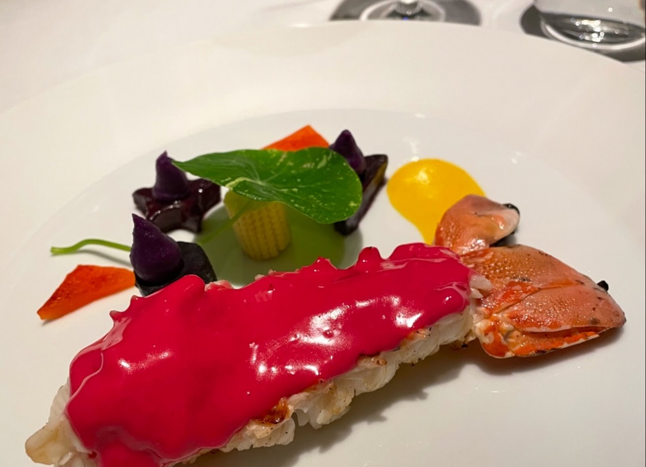 沙拉:蟹肉完全沒有新鮮食材的鮮甜,只有鹹味。鴨肝吃一小口還行,第二口開始會膩,但擺盤蠻特別的,尤其旁邊一小撮食用花沙拉跟大理石盤很漂亮。