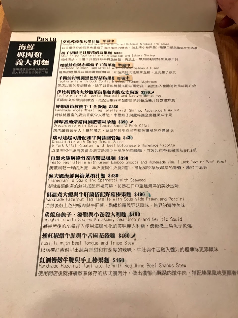 培根蛋黃義大利麵醬汁濃厚很香,麵條煮的是麵心稍硬的方式,麵條能緊裹上醬汁,口感很好。干貝松露義大利麵 ,鋪有兩顆鮮嫩的大干貝,也是很好吃,可惜的是配料的筍子苦味很重。