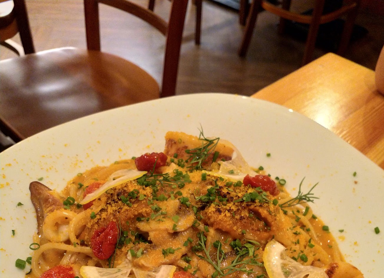 用餐氣氛佳 食物風味棒 提前祝我10月生日快樂 BTW 照片是所有餐點中 我最喜歡的一道–炙燒烏魚子海膽麵 口味溫潤的醬料搭配新鮮的海鮮 還有軟硬適中的麵條 堪稱本日最佳 下次一定再來!