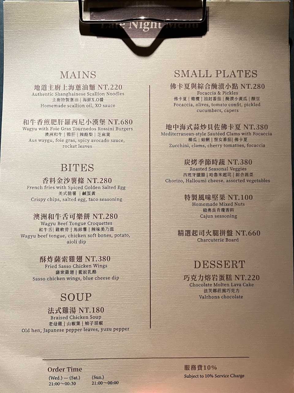 我是平日晚上9.來吃的!點的牛肉漢堡?真的是我吃過最頂的漢堡(≧▽≦)其他的料理也都好吃到沒話說 拌面(?)看似單薄但意外的很有味道麵條也是我喜歡的麵體(*’▽’*)♪小章魚?那道也是非常驚豔~肉質很軟嫩也調味的很好♡ℒฺℴฺνℯฺ♡調酒?跟紅酒?也是不得了~雖然平常我沒在喝酒也不懂 但至少我喝的出來好不好喝(๑❛ꆚ❛๑)結論是 都好喝꒰✩’ω`ૢ✩꒱另外裝潢的部分也是很放鬆舒適 如果要說美中不足的地方 就是空間聲音沒有區隔的很好(但能理解空間就是這麼小)加上我去的當天人超多又是很多長輩在喝 整個環境鬧哄哄的 跟我們一起吃的長輩要叫服務生也不好叫ᶘ ᵒᴥᵒᶅ可能是太吵沒聽到~不過整體還是必須給很高分ᕦ(ò_óˇ)ᕤ“服務態度也是非常不錯!遇到厲害的人就先給推 從容應對非常讚ଘ(੭ˊ꒳ˋ)੭✧