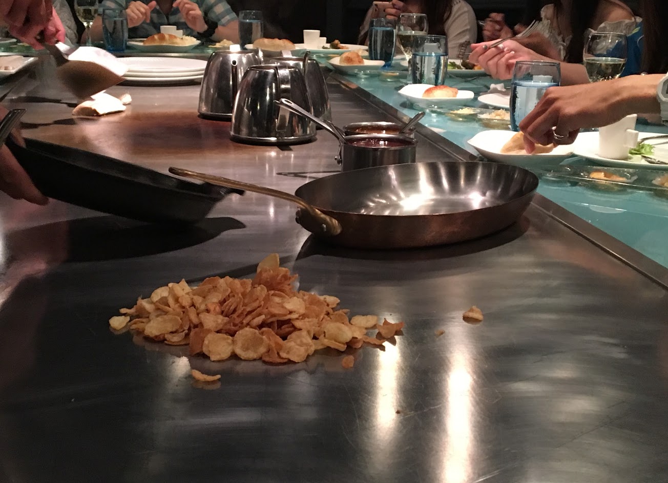 份量很大,就算單點也有麵包、飯、香檳。邊吃邊看做菜表演,很新鮮。主餐推蒜片牛小排和蘋果松阪豬!甜點栗子蒙布朗好吃♥