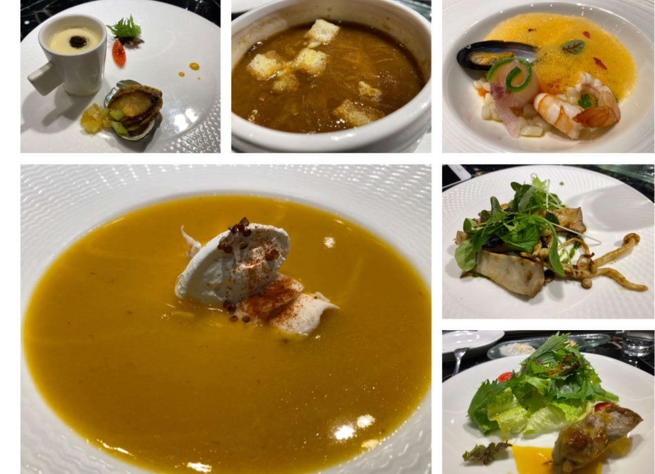服務真的是一等一的棒。 無酒精香檳真的跟評論裡面說的一樣好喝又可以一直續杯。主菜鴨胸份量跟香味(鴨味)都很棒,牛肉會先煎一部分測試熟度非常有心。 生菜三樣都好吃。 只有前菜創意料理部分口味偏古怪,蝦子背上的腸線很髒(本身對這個過敏),還有蛋糕入菜非常不搭。 麵包配沾醬好吃,但濃湯普通。 最後甜點飲料會到另外的一區享用,就像一次到了兩家店一樣的新奇體驗。 甜點建議點烤布丁跟巧克力。紅莓那個好看可是偏硬又很甜。