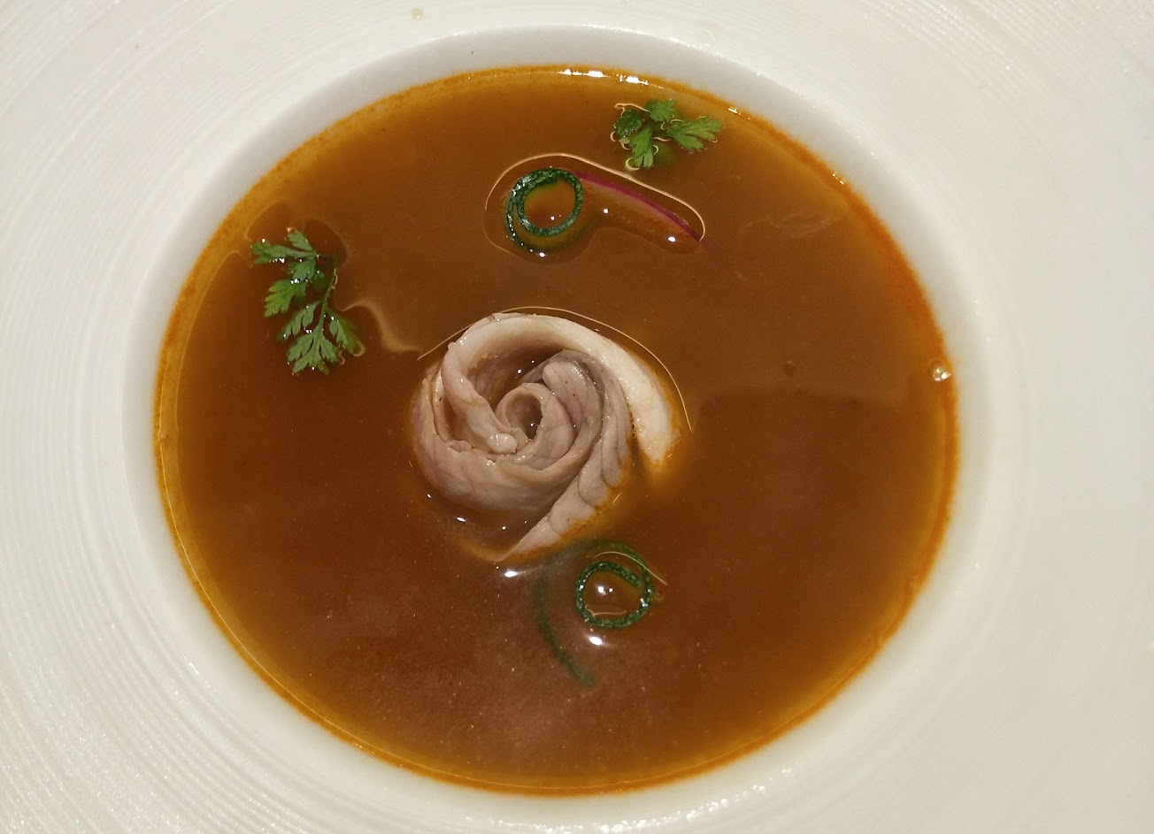 接著,是送上剛烤好、熱呼呼的帕瑪森起司麵包。外酥內鬆軟,帶點微鹹的起司風味,搭配一旁蒜味魚子醬(右邊),微辣的蒜頭香氣讓麵包有著更上層次的風味,真的好好吃啊!不愧網路上評價真的很好,當然,想吃麵包也可以免費續加~主餐來前會送上一杯檸檬SORBET,也可以免費續,能稍微清除口中殘留味道,好好迎接主餐的美味。