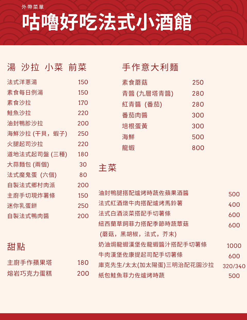 法國餐廳 – 美味的法國美食,價格非常合理。從配菜到主菜,份量都令人滿意,味道十足。店內裝潢舒適而悠閒,店主顯然以高超的技巧和熱情準備菜餚。這絕對是台中最好的歐洲餐廳之一。