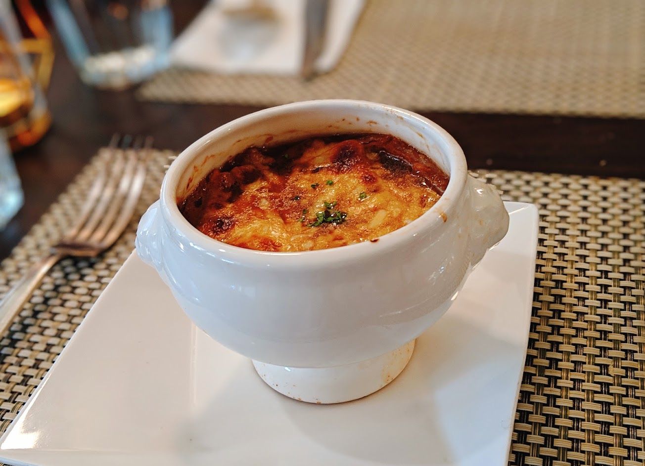 焦香的法式洋蔥湯舖著烤到又酥又牽絲的乳酪是必點!