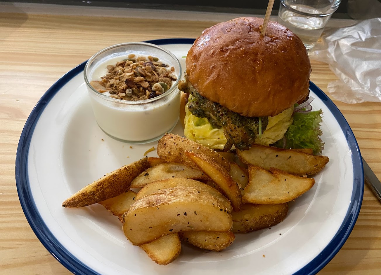 手作的漢堡麵包烤過之後邊邊脆脆的很好吃,雞腿排很嫩很好吃,不會有一大堆的醬料來調味,生菜跟雞腿的組合就很自然美味,薯條搭配上面撒的粉脆脆香香的很讚。優格裡面不知道是不是有放奶油乳酪,還是那其實就是優格本人?,會吃到一點點結塊的東西,我覺得很好吃,黑糖跟麥片的搭配也很加分!
