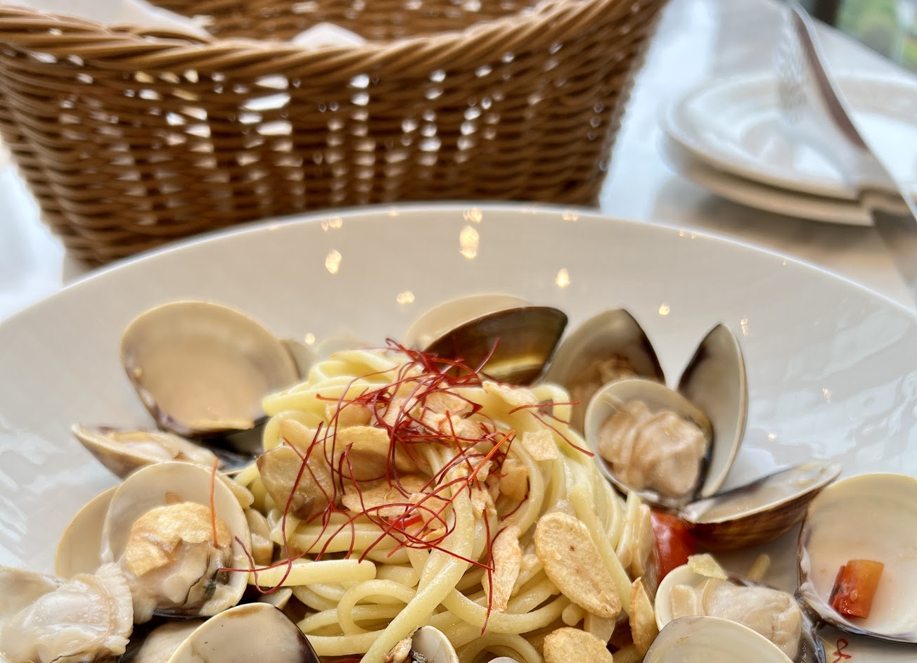 當天為平日晚上造訪,客人數不多,整體用餐氛圍很靜謐☺️ 沒有遭遇Google評論上所述假日服務欠佳問題 (反而是很常來補水,吃完一道服務生就光速來收盤?) 也沒有出餐過慢的情形…… 果然平日來用餐好,還能悠閒聊天邊欣賞窗外大樓夜景??