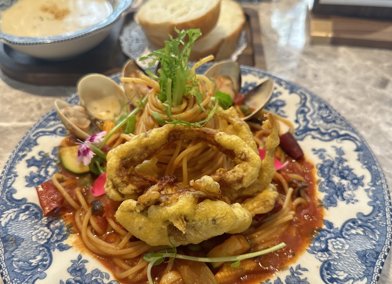 煙花女軟殼蟹義大利麵 $350 套餐+110(湯品/麵包/飲品折抵80) (我覺得義大利麵都大同小異,要煮的非常好吃很入味不簡單,朋友說他的醬料很特別帶一點辣,以義大利麵來說很好吃,重點可以加麵+30是可以吃得非常飽的)