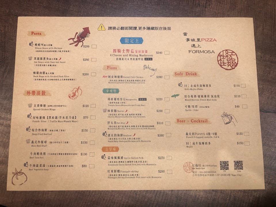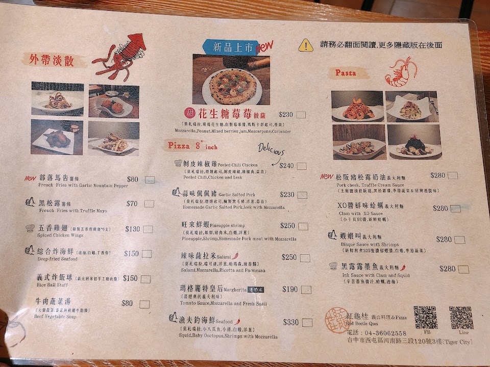 今天來老虎城 看到這義台料理和披薩, 沒吃過來吃看看, 點了一個他們菜單前面有按讚的 漁夫釣海鮮 pizza 裡面有小八爪魚小卷白蝦洋蔥 等等 他比較薄 皮的, 口味蠻好吃的。 還有點一個蝦蝦叫一大利麵 上面寫新鮮熬煮 200支濃郁蝦醬、 白蝦季節、蔬菜, 蝦子的味道很濃鬱 ,上面的蝦子擺盤很漂亮,好吃。 還有點一個松子青醬蛤蠣義大利麵,手工青醬、新鮮蛤蠣, 比一般義大利麵的青醬更濃加上松子 還不錯 ,如果蛤蠣再大一點應該就更好吃了, 飲料點了伯爵柚子茶, 韓國的柚子醬加清爽的伯爵香味不錯喝,容量不大、幾口就吸完了 ,整家店的東西不錯吃, 只是位置比較擁擠, 還不錯推薦大家來吃。 Google在地嚮導, YouTube與 fb搜尋:Jerry愛分享, 介紹在地美食+旅遊+趣事