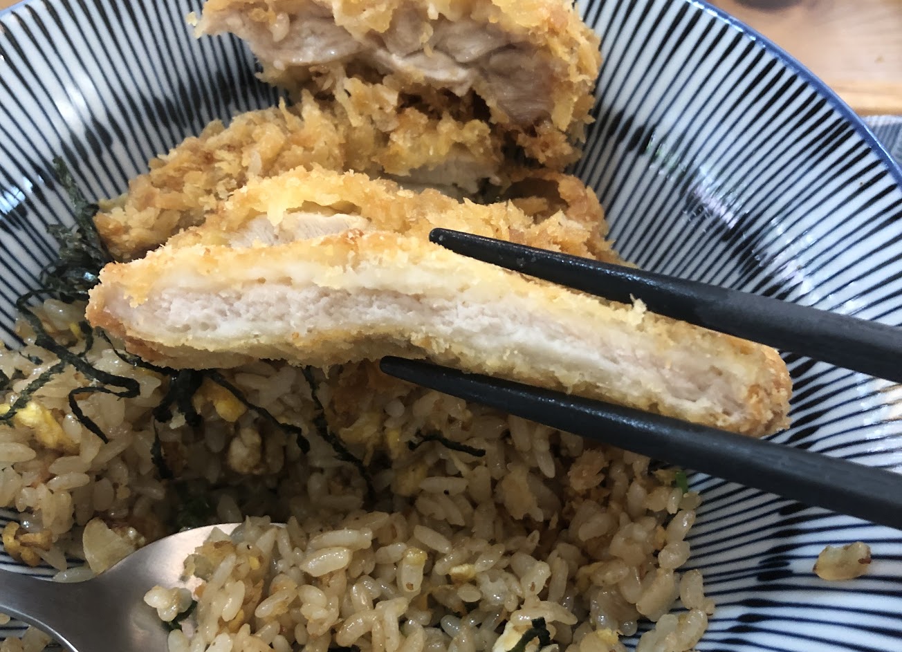 炸雞排炒飯 、炸豬排炒飯。炒飯粒粒分明有鍋氣,是比較乾爽不含油的炒飯,但是有點鹹吃完會口渴。