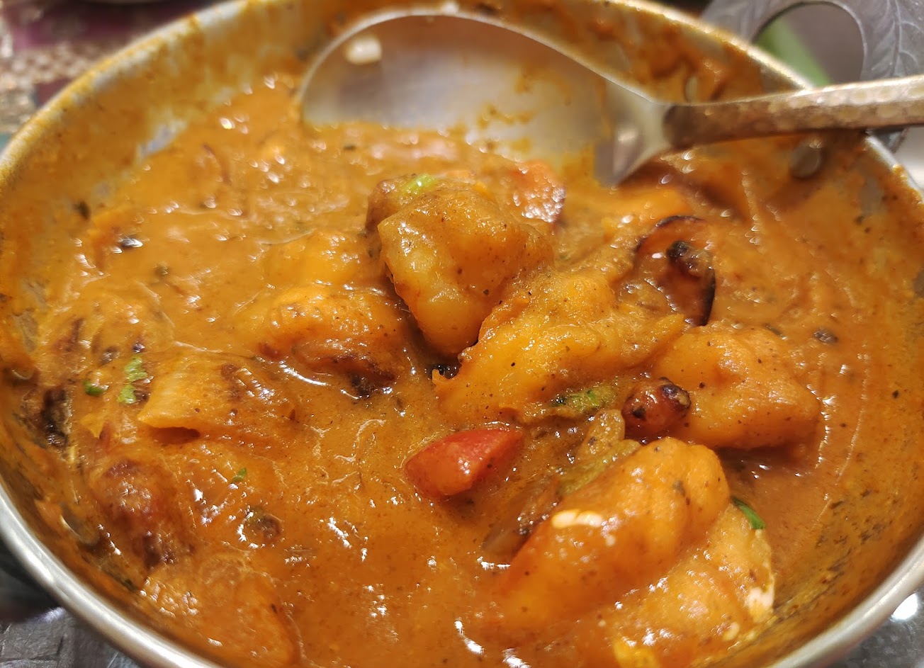 經常經過這個印度餐廳,很怕踩雷一直沒進去,但又好懷念印度咖哩,看看菜單咖哩不到三百的價格,可以試試,我吃的是香料牛肉咖哩,和日式咖哩不一樣的是印度咖哩整個用香料還有蔬菜燉煮牛肉到軟爛,香氣比日式咖哩來的濃烈,香味層層疊疊,有嚼勁現烤的烤餅沾咖哩,剛入口只有香料直球對決般的印度咖哩,口味不鹹然後還有淡淡奶香~嚼了幾口淡淡茴香又再嘴巴裏蹦開,還不錯吃,到後面身體越吃越暖和~想再吃印度料理的時候一定會再回訪 。可能口味真的很印度,大部分人不太習慣濃厚的香料…用餐的時候只有我一桌…真的好吃…
