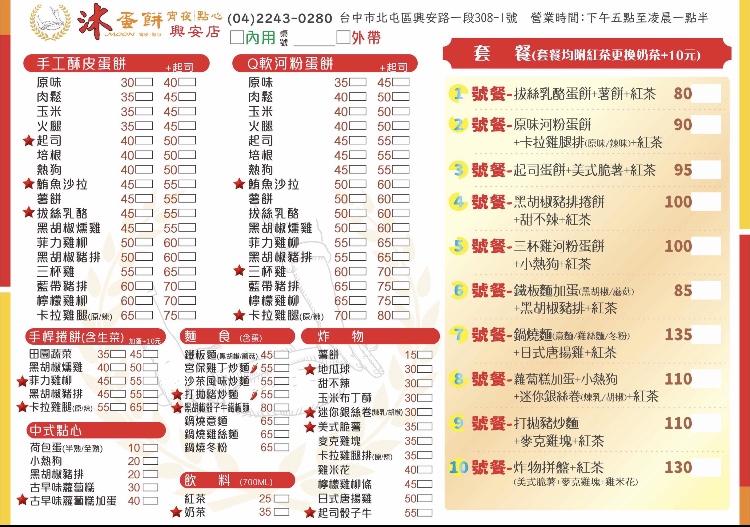 晚餐不想吃正餐的美食家多了新的選擇,店家提供了多種口味的蛋餅,手桿捲餅,炸物,中式點心及麵食,如果不知道怎麼選擇,店家另有提供10種套餐,每款套餐皆附大杯飲料,可加10元更換奶茶。