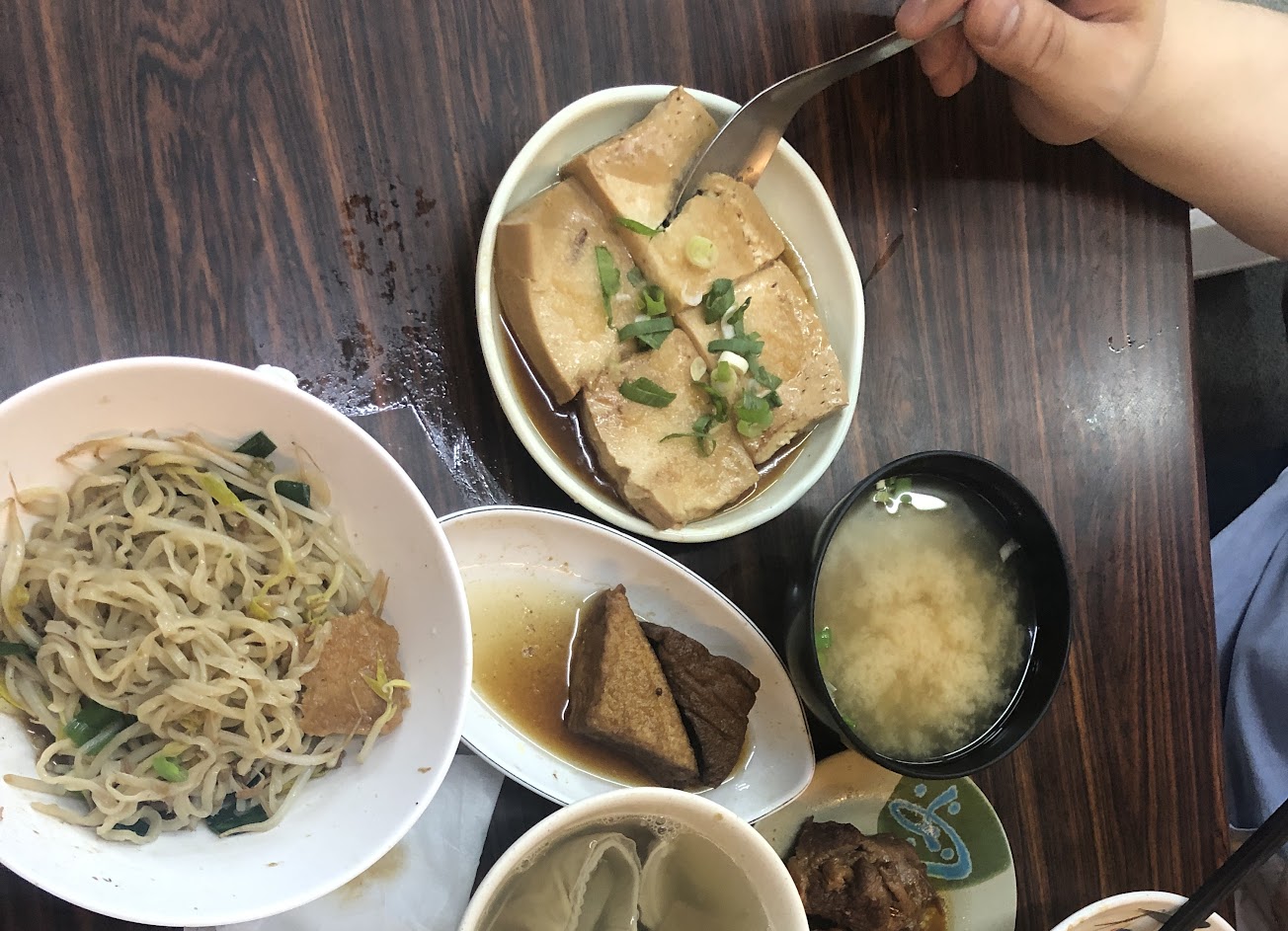 人生地不熟,住附近的旅館走出來找東西吃,看到人挺多的,似乎是老店就進來吃。三人點了排骨飯,意麵,滷白豆腐,燙青菜,滷肉飯,酸菜豬肚湯,味增湯。喜歡店家的腿仁,滷的很入味,滷白豆腐也不錯