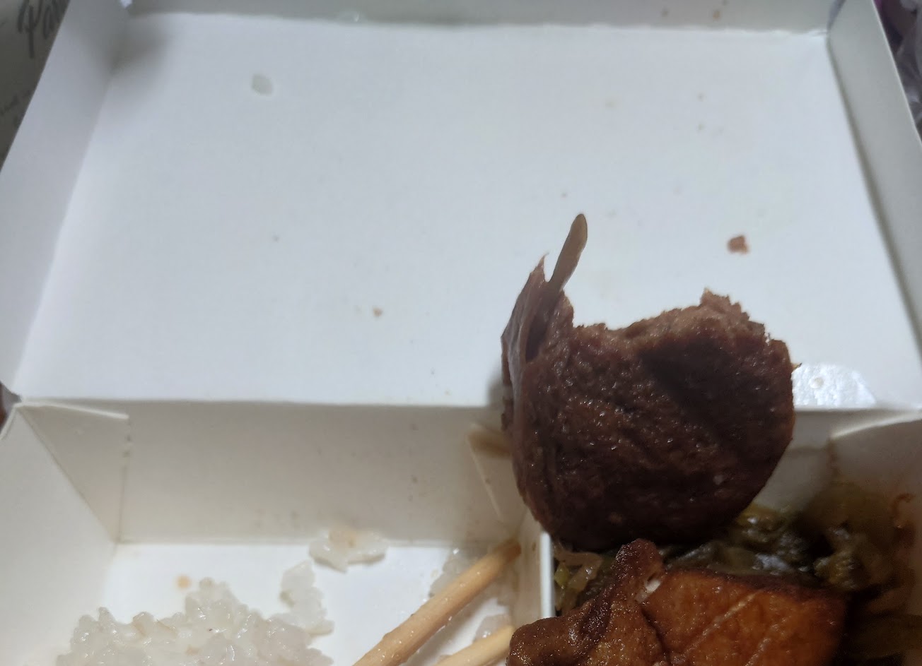 腳筋給很多塊 每塊都很大 一咬下去 真的會微笑 平常喜歡吃筋的我 真的超幸福 又軟又黏又紮實又軟糯 慢慢膠原蛋白 太好吃了啦 配菜有豆輪跟筍乾 因為兩碗都是便當 另外一份的青菜給我們白菜滷 蠻貼心的店家