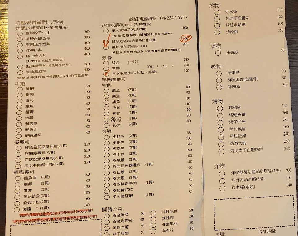 壽司選擇蠻多的,不太敢吃生食的話,這裡有蠻多選擇的,服務態度也很好,問一些食物方面的問題也很熱心介紹與回答,出餐速度也相當的快,本以為跟外面一盤40元壽司大小差不多,跟友人就點了24個大滿貫,但吃到6個就差不多飽了….份量蠻大的,建議可以先點12個壽司,太少吃不飽再點其他的