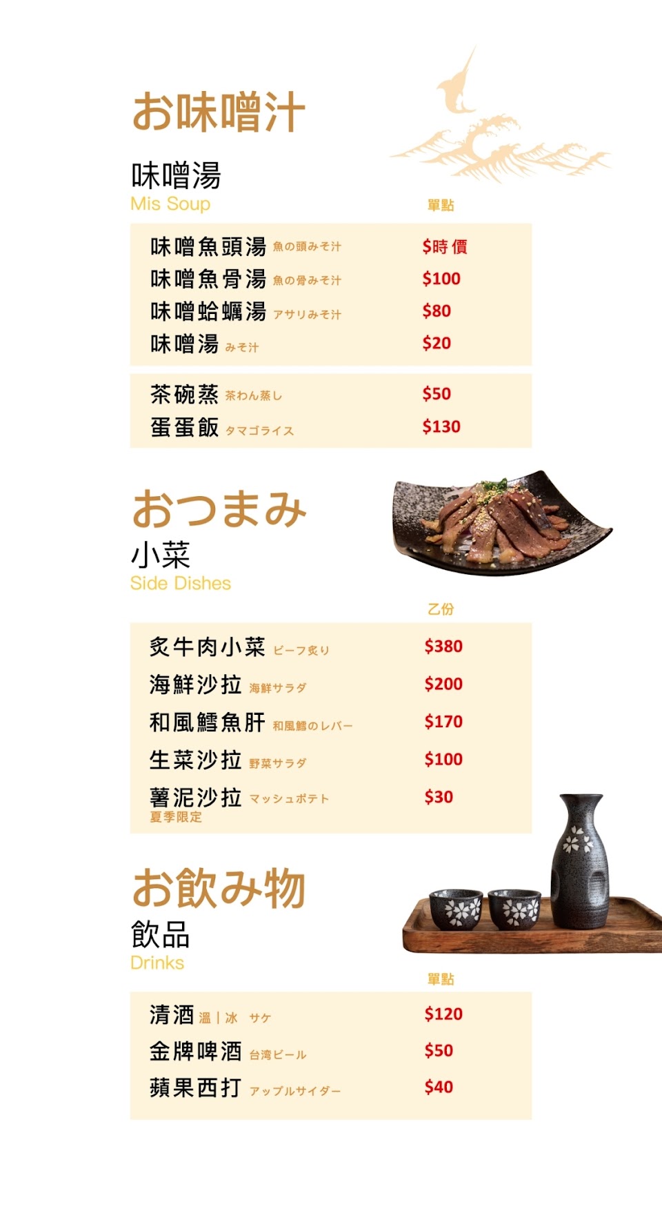 菜單主要只有生魚片與壽司類,沒有什麼烤物等其他料理方式的餐點選擇。