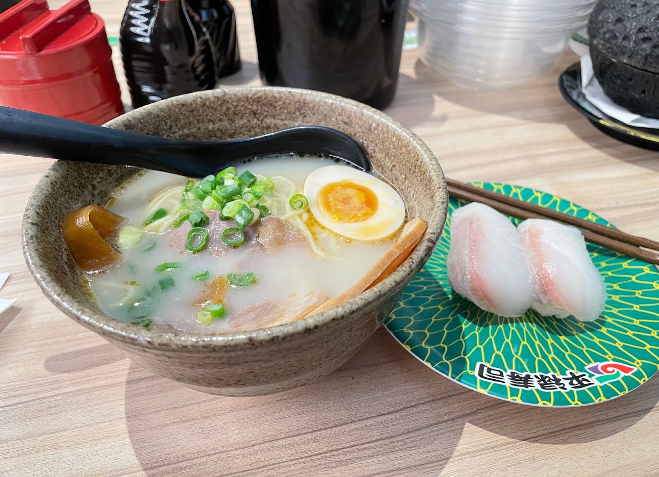 我們全家是迴轉壽司的極端愛好者,因此臧壽司、壽司郎、爭鮮⋯我們都光顧過,尤其是臧壽司!相較之下,平祿壽司的醋飯口感不如臧壽司,生魚片的鮮甜口感也落後⋯但平心而論,整體握壽司口感尚可。我們之後也叫了湯麵,附上的炸蝦天婦羅真的很虛且口感不好⋯