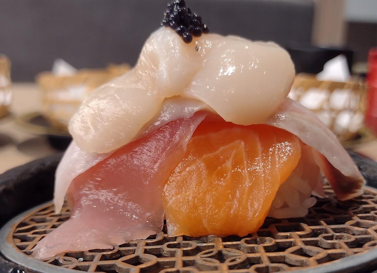大致上覺得還不錯!焦糖鮭魚很好吃又便宜!貓貓帶位小孩會挺愛的!螃蟹味增湯!看看就好!螃蟹沒味道!大幸是不腥!味增湯算然料多但很多骨頭!不建議給孩子獨自享用!壽司跟其他家有些許不一樣!玄米茶蠻好喝的!平板很人性化!竟然還會幫你平分每個人大約吃了多少金額!稍嫌不足的地方可能就是衛生了!第一次吃竟然有頭髮!還有蚊子還是蒼蠅在旁邊飛!告知服務人員他是拿走說換一盤!但也不知道是否只是拿起來或者銷毀!這點觀感比較差一點!對了!廁所跟日本一樣是免治馬桶!女廁只有2間!剛好去時竟然要排隊!有點小小聯想!但我還是會去吃!焦糖鮭魚!!熱愛