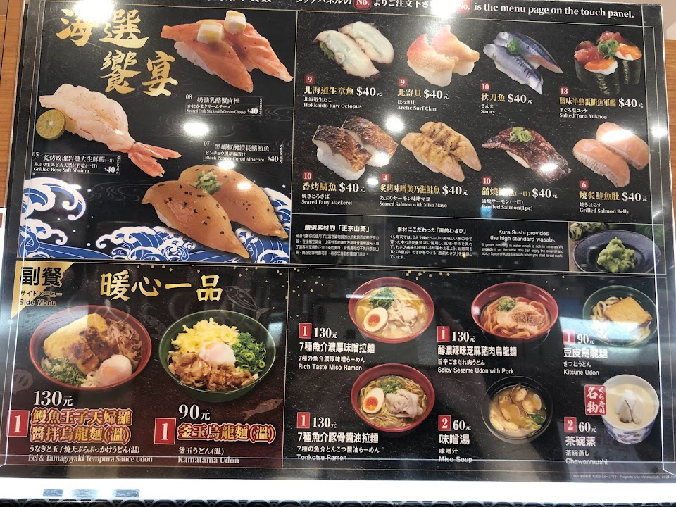 可能是壽司郎吃習慣了就比較容易相互比較,首先App訂位壽司郎方便很多,可以很快速找到自己要的分店,藏壽司用的是E排客,有時要找到藏壽司就不容易,找分店相對困難,接著是店內點餐系統比較習慣壽司郎的介面,比較直覺,且平板可以拿下來讓做外側的人使用比較方便,藏壽司點餐相對沒這麼方便,在餐點不部份壽司郎選項豐富很多,且有人氣組合,例如鮮蝦三貫….等等,軍艦有安康魚肝,炸物壽司郎有豐富很多,餐點運送帶壽司郎不需急著拿下,這也方便很多,也許這樣比較不客觀,但總覺得壽司郎較吸引人一些,用餐環境跟服務則大致相同。