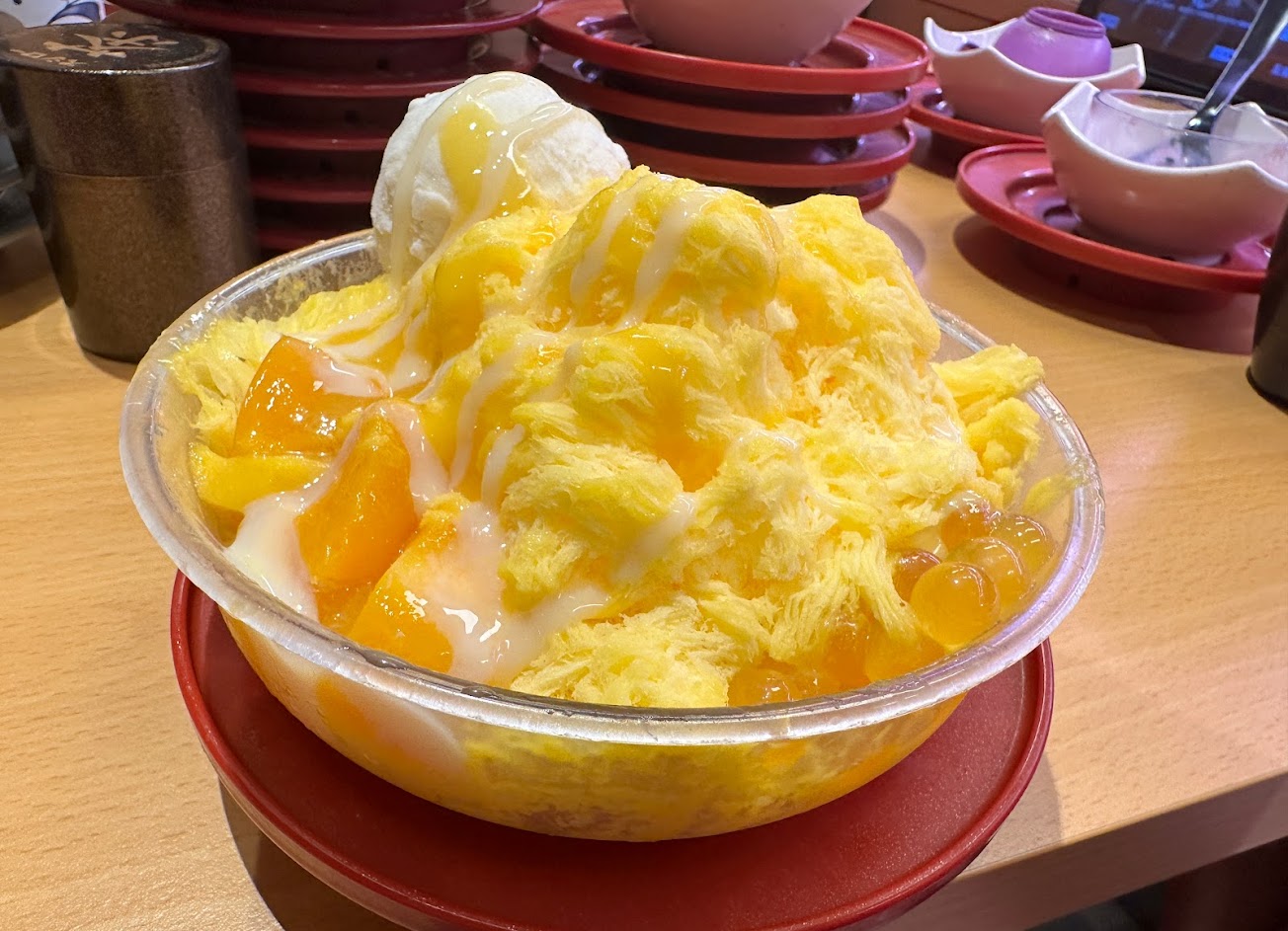 天婦羅、鮮蝦、生鮭魚、芒果冰。
