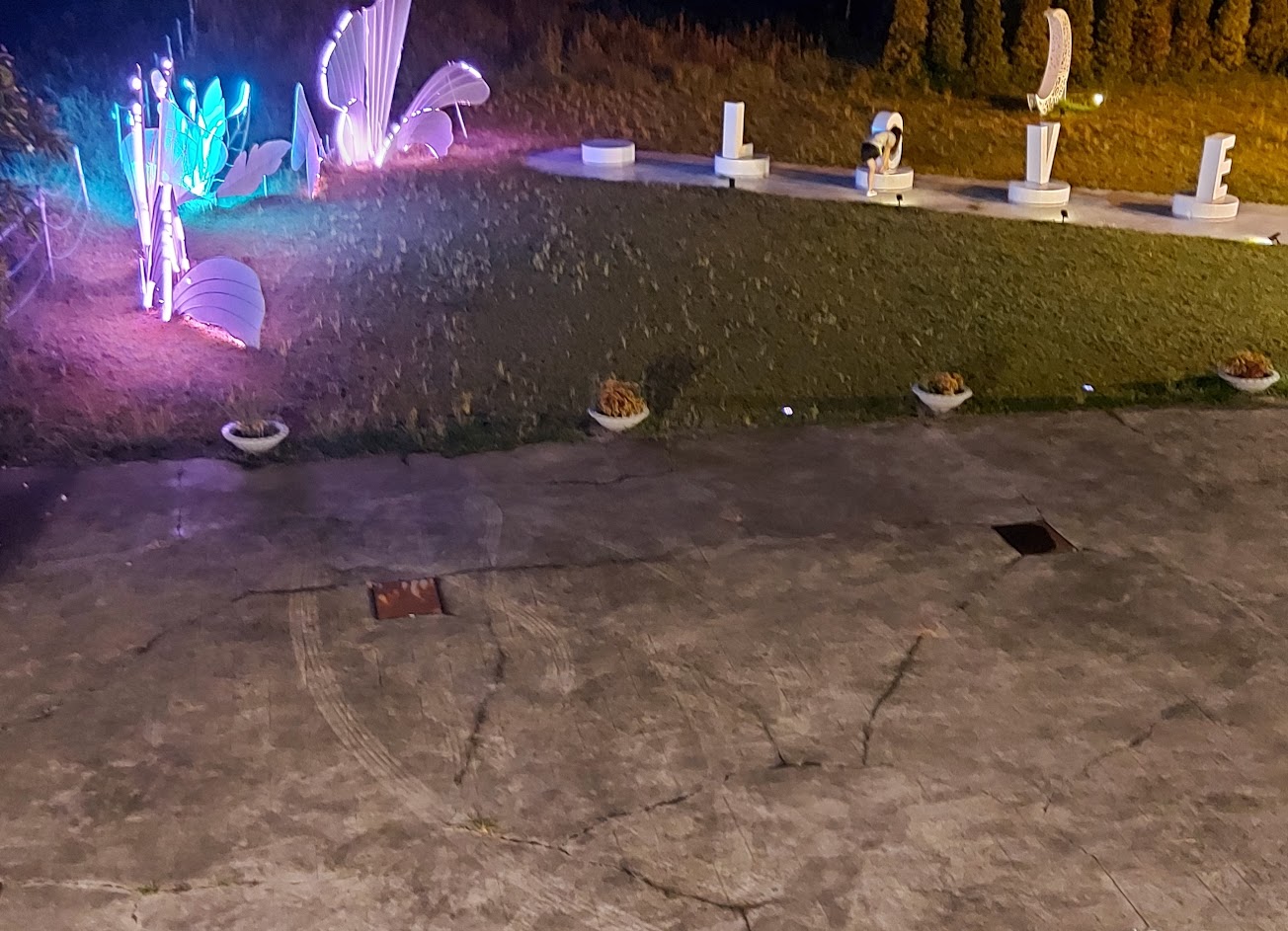 戶外草皮設有裝置藝術可以拍照打卡,遠處還有夜景可以觀賞。