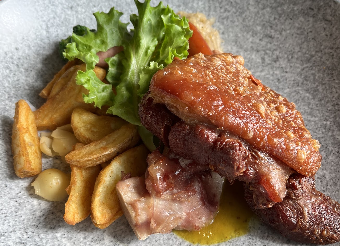 麵包很乾,口感不好;烤半雞肉質也有些乾柴;配菜的通心麵口感軟爛;只有炸薯條是好吃的;擺盤也很弱,最後的泡芙也很普通。 餐廳裡有蒼蠅飛舞,我們的泡芙還被蒼蠅親到,感謝服務生立刻幫我們換新,這點非常肯定。
