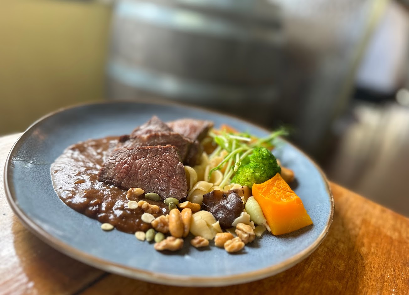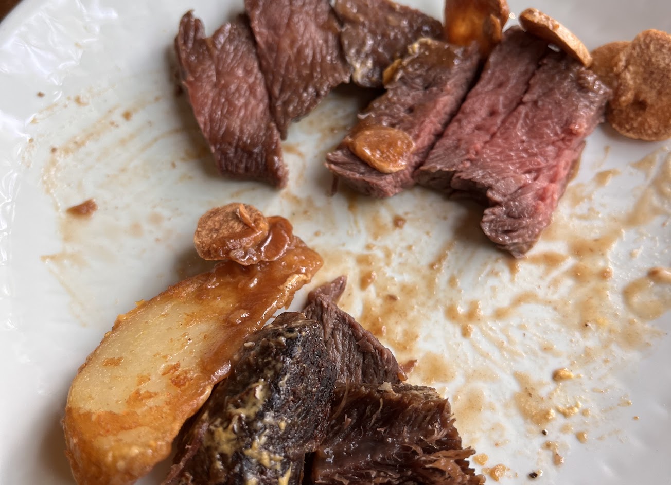 這道菜被標榜為焗烤燉牛肉馬鈴薯,但實際上更像是肉乾。配上馬鈴薯塊,相較於前菜更像是主食,其中3/4的內容物都是馬鈴薯,同時燉肉並不好食用。