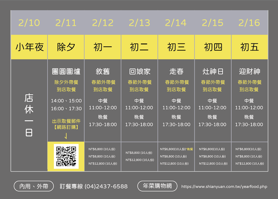 | 星期日 | 11:00–14:00 17:00–21:00 |