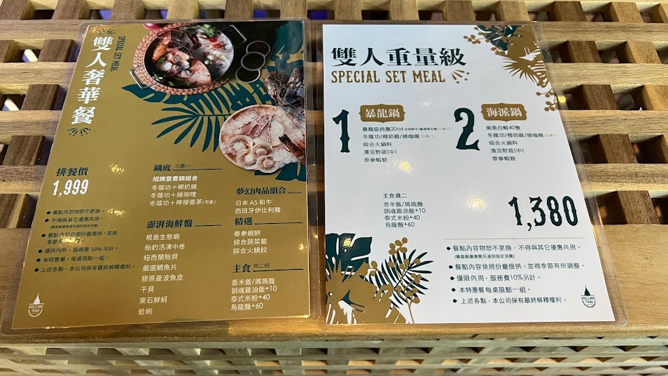 氣氛很夠的火鍋店,南洋風味還有裝飾一顆月亮在黑黑的天空,再加點微風,你會以為在泰國喔!火鍋湯底綠咖哩加東蔭功,雙人奢華餐應該就很夠吃了,除非要聊久,點個炸皮蛋、魚漿、蝦餅和飲料也不錯,用餐約2小時,最好訂位,內有各式包廂格局,可再訪。