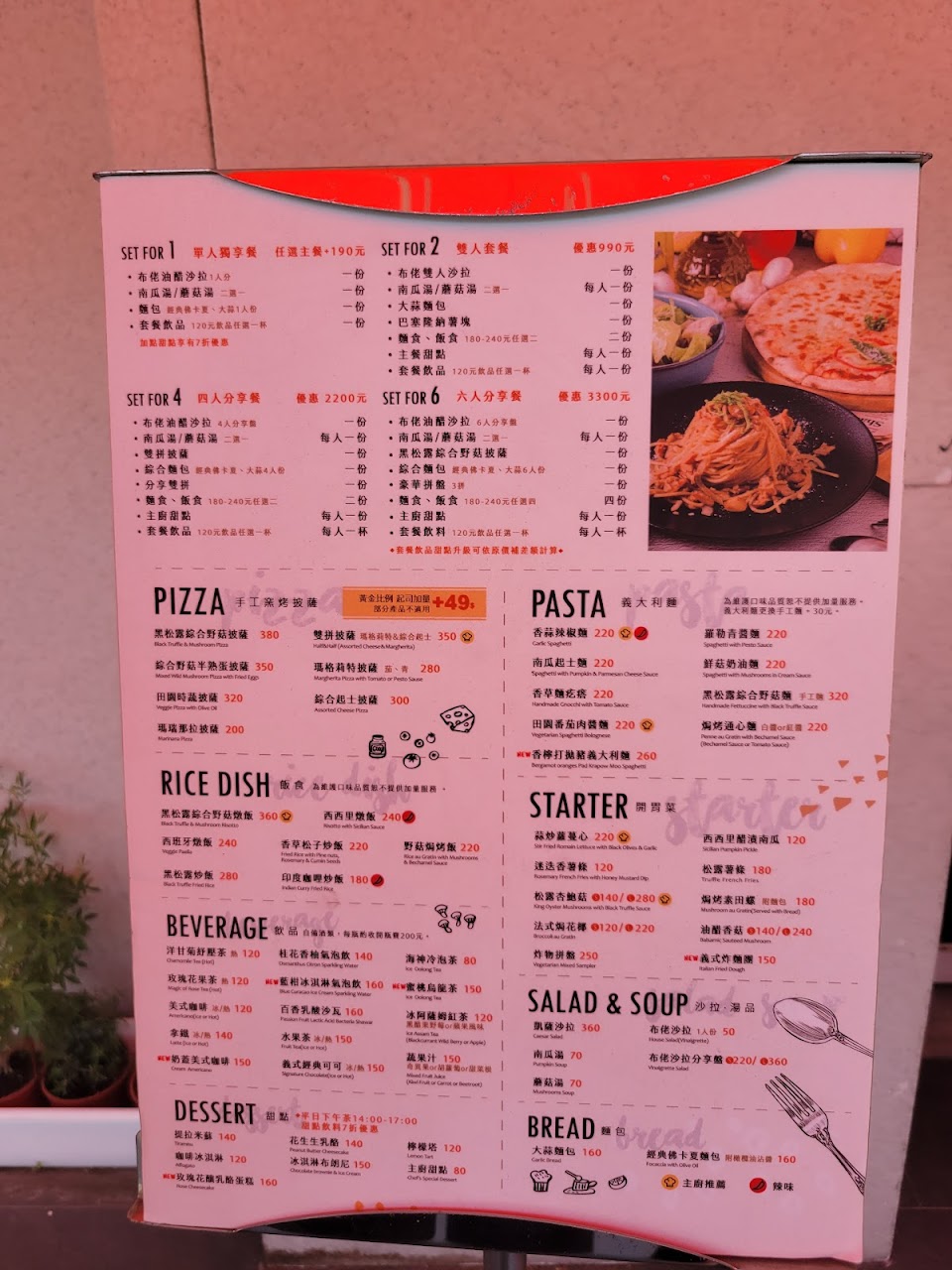 瑪格麗特披薩, 南瓜濃湯, 野菇披薩, 黑松露炒飯, 甜點, 蔬食披薩, 田園時蔬披薩