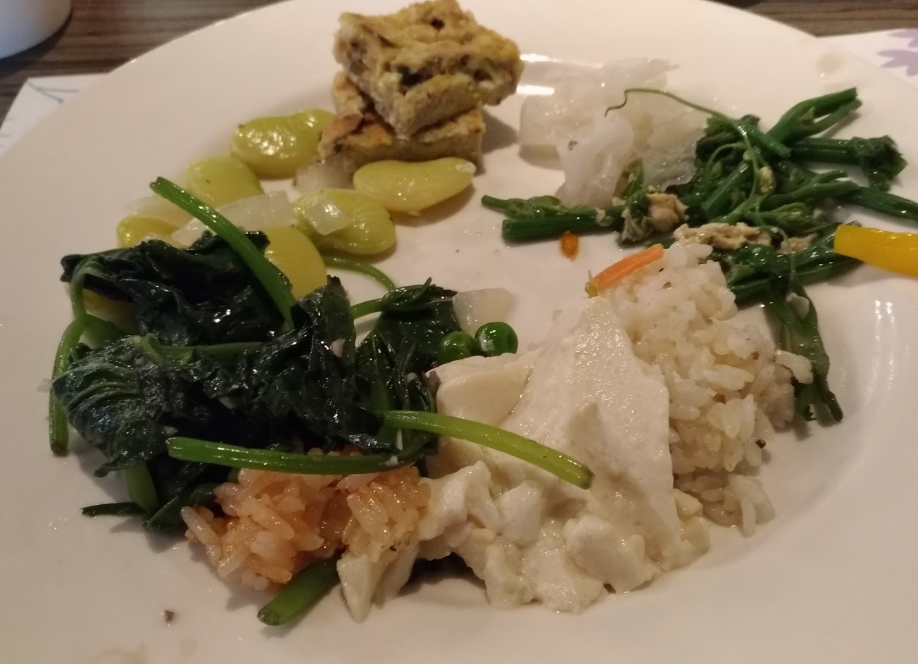 素食吃到飽,菜色不重複,每夾菜一次就又發現新菜色,就算飽了還是有股慾望想看又有啥可以嚐鮮。第一次發現原來地瓜葉也有新吃法,用羅勒調味更能提高味道的層次感。