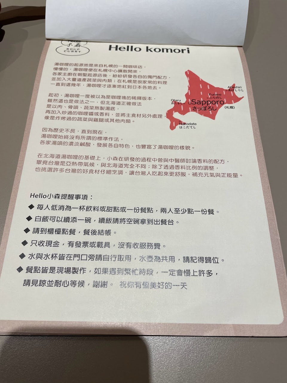 老闆娘不太笑,看起來很嚴肅,但有向我們細心介紹菜單和甜點,上餐時也詳細說明北海道湯咖哩吃法,給人一種職人精神的感覺。