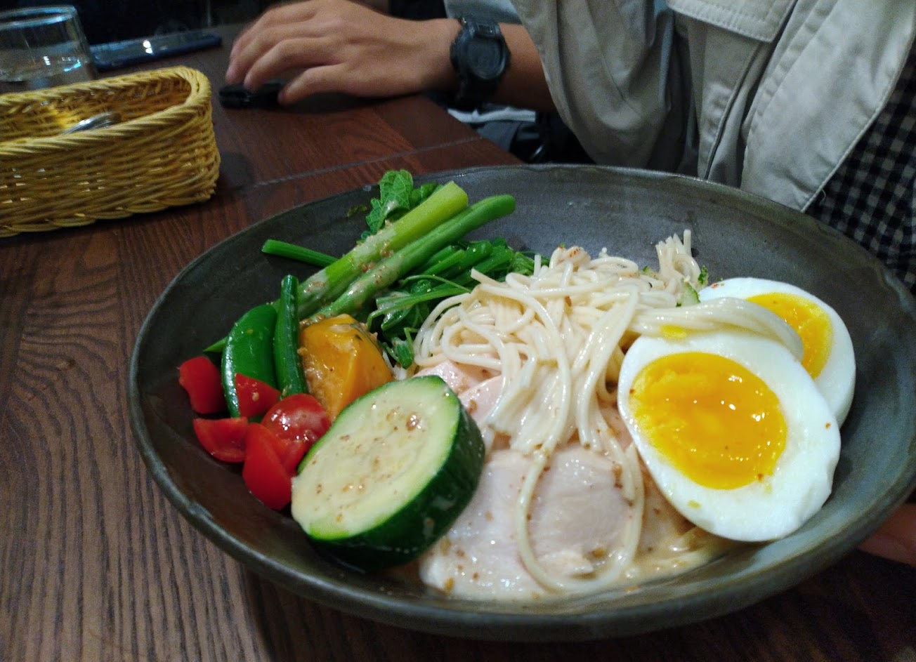 小森家的沙拉竟然不是用生菜而是用龍鬚菜,搭上胡麻醬真的是絕配,而且裡頭的黑豆和柴魚片越咀嚼越香,溏心蛋也不馬虎!