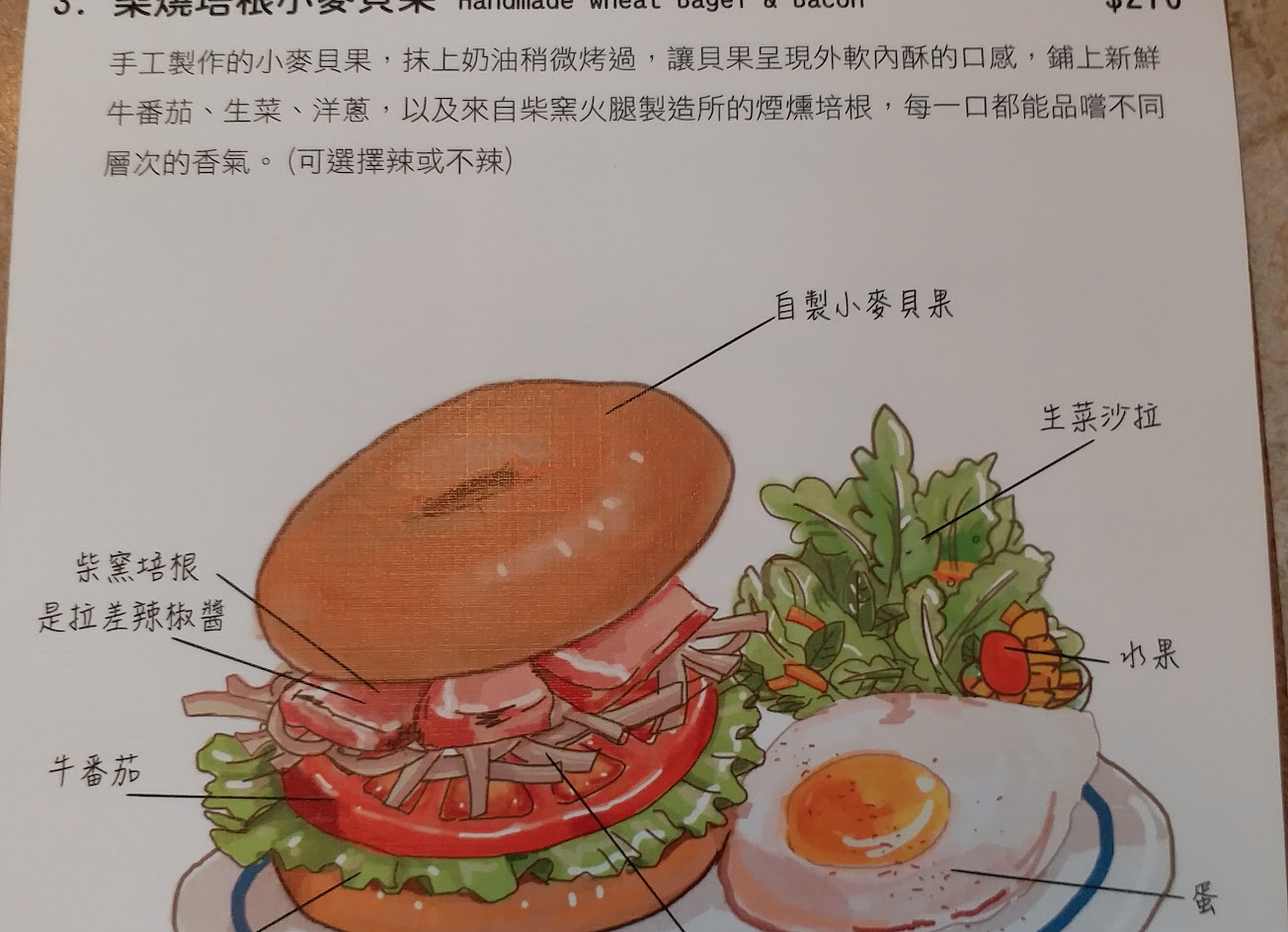 自製貝果紥實好吃,用好的柴窯培根與新鮮有口感的沙拉,感覺到老闆食材用心與不隨便。