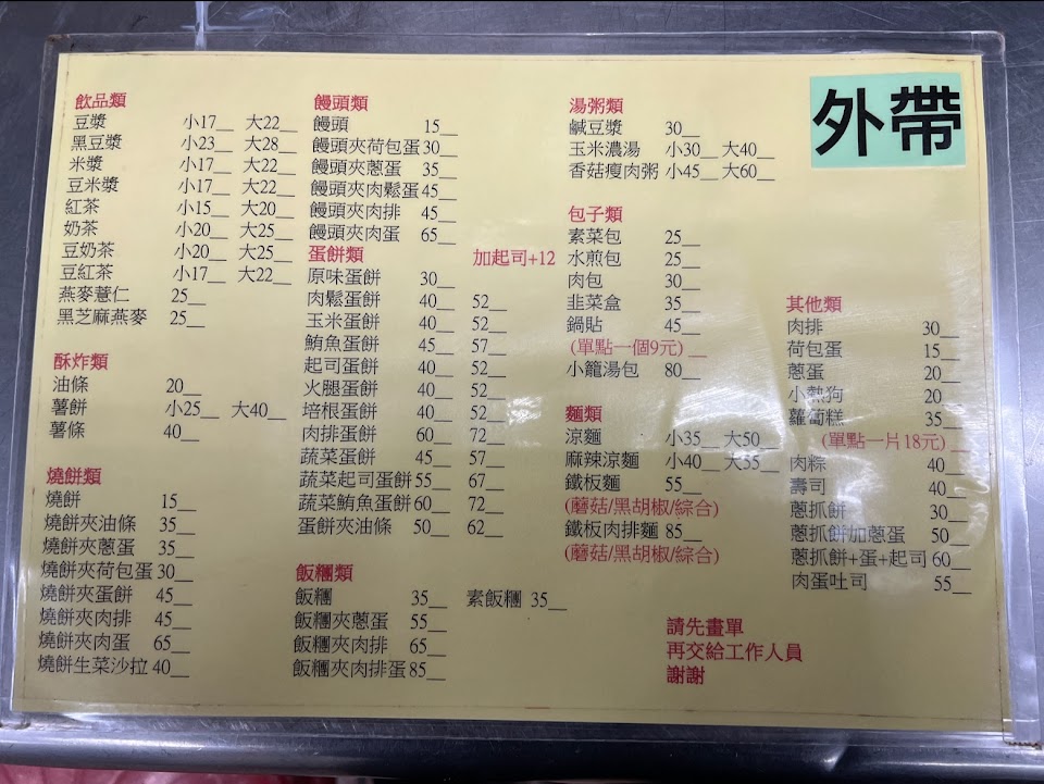 肚子餓時的好地方 服務 外帶 餐點類型 早餐 平均每人消費金額 $1-200 餐點:5 服務:5 氣氛:5 建議的餐點 米漿豆漿燒餅, 肉蛋燒餅