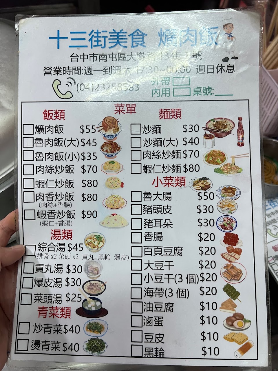 路過的時候看生意非常得好就進去嘗試了一下,點了一碗招牌焢肉飯,他的焢肉顏色看起來很好吃,瘦肉不會很柴,味道我認為是尚可,但是在這一區域算是不錯的,肥肉也不會讓你吃起來很油膩,搭配他的特製辣,會飯有滿滿的香氣,一直在你的嘴巴與鼻腔產生共鳴,綜合湯非常的有飽足感,他的料很多,湯頭算中規中矩,我覺得最好吃的是他的滷味,我最喜歡的是當滷味放在你的桌上的時候,他還會冒煙,熱熱的吃感覺更好,他的魯大腸非常入味,可以讓你教好幾碗白飯專門陪他子魯大腸就足夠,不僅是魯大腸很入味以外,他其他的滷味香氣十足,我看了現場很多人,他的炒飯,看起來應該很厲害,下次經過的時候應該要來吃他的炒飯看看,整體來說,附近都有車格算是好停車,感覺又是在學區的附近,年輕人很多,價格很親民,在當地算是小有名氣的老店 服務 內用 餐點類型 晚餐 平均每人消費金額 $1-200 餐點:4 服務:5 氣氛:3 建議的餐點 十三街特製炒飯