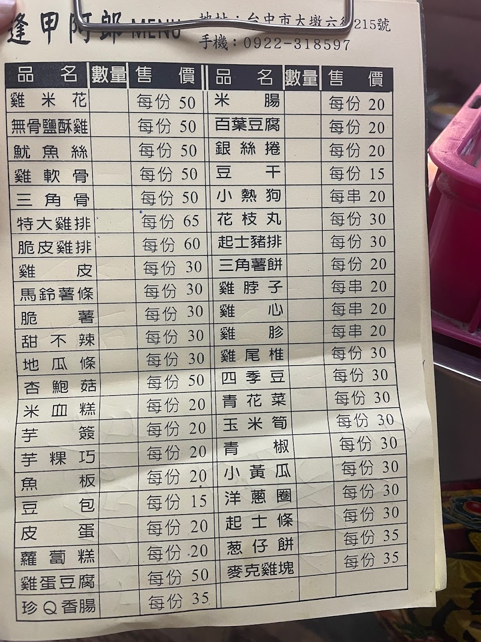 整體而言,吃起來不像逢甲阿郎,比較像是掛著逢甲阿郎名字的鹽酥雞店,相比於總店跟精誠店,這品質真的差太多了,如果是第一次買的人,恐怕會讓人萌生連其他分店或總店都不想再買的感覺,希望能夠控管一下品質,至少那個雞的部分我是覺得真的有點誇張了。