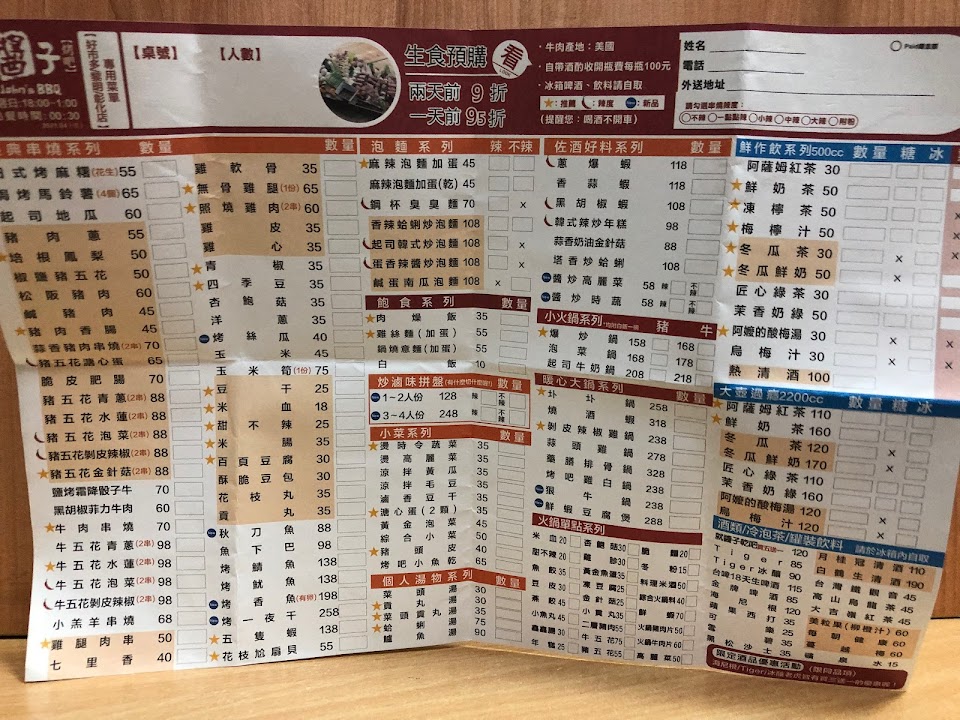 每況愈下,是不是換老闆了,玉米筍永遠烤不熟,炒泡麵偏乾,連基本的烤豆乾都變超難吃,用微波爐都比這好吃,蔬菜類幾乎都消失了,單價變貴食材縮水,人不多烤物還是要30分鐘起跳,來了N次,這次是最後一次到訪了。唯一沒變的品質是18生啤酒!我隔壁楓康買就好!