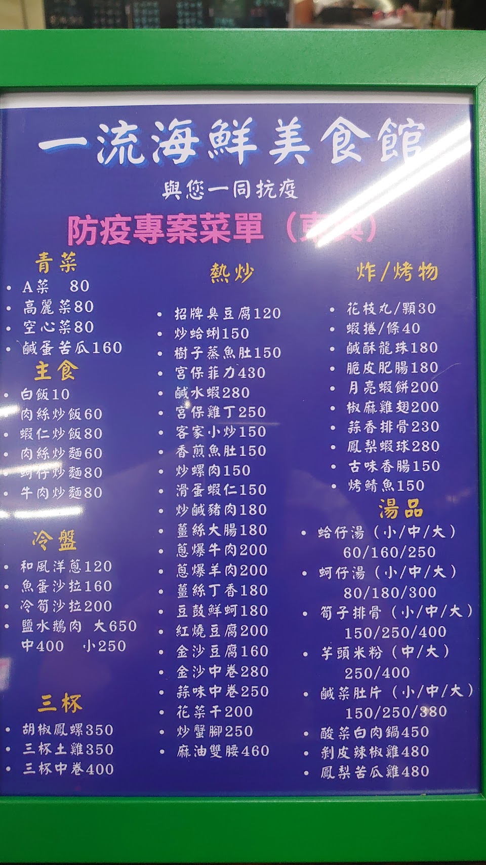 一流海鮮美食館的料理口味精準,沒有一般熱炒店過鹹的情況,很符合個人的喜好,餐點價格也不算貴,但東興店算是半開放空間,坐落於街角且有部分座位靠路邊,對用餐環境的較要求的人,建議前往其他間分店用餐。