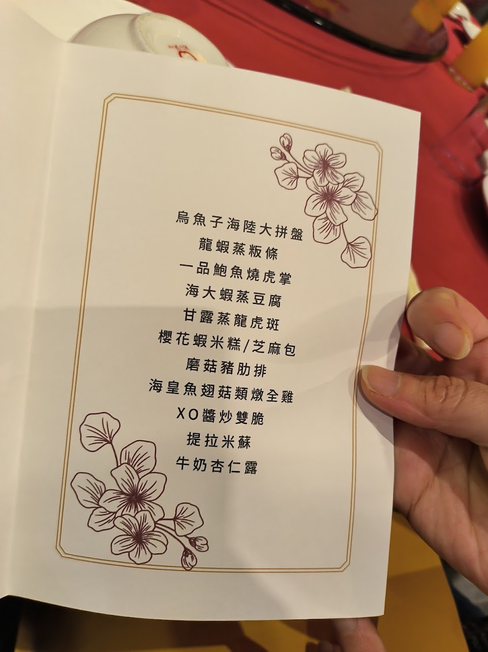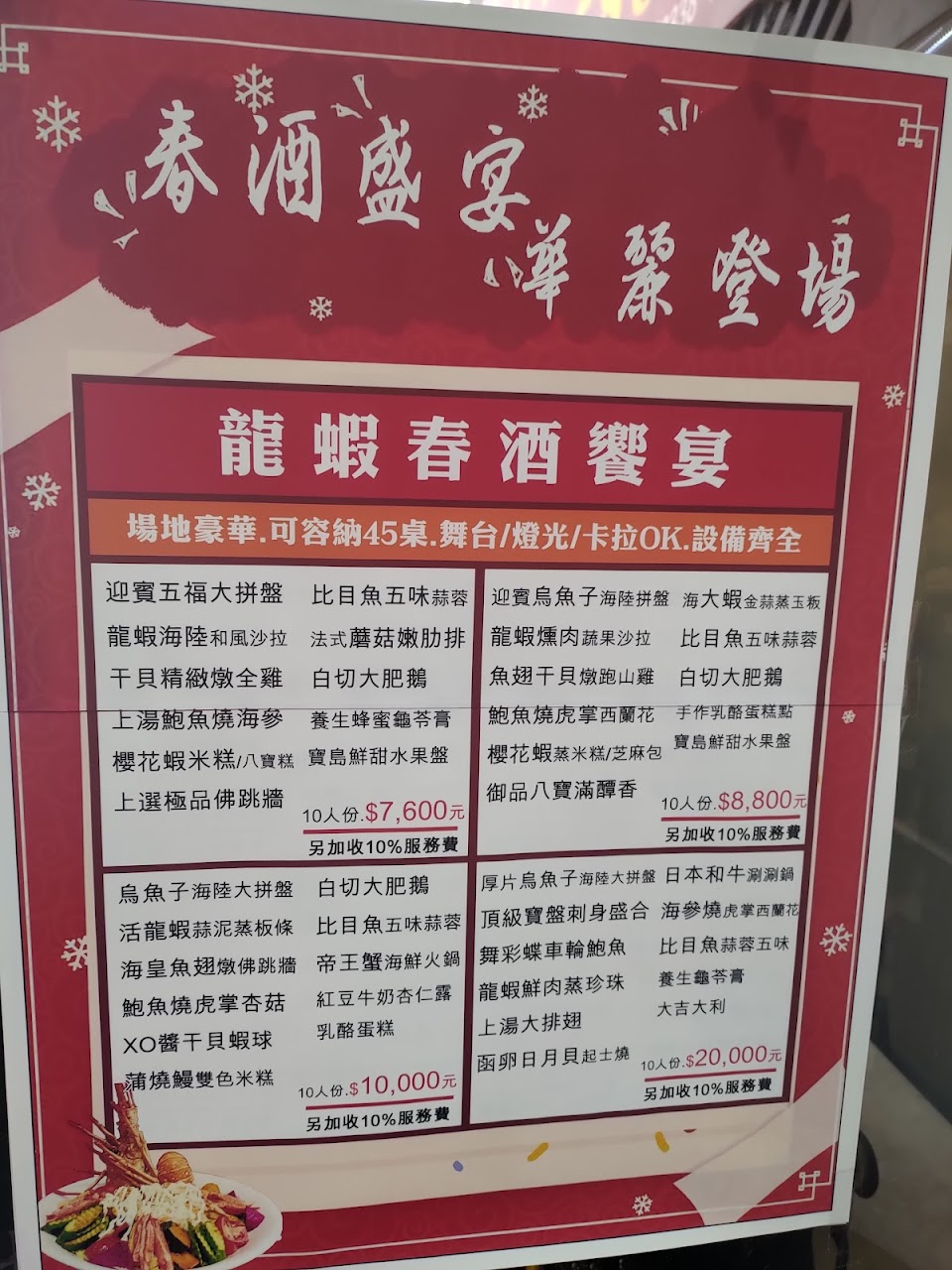 清蒸石斑魚, 甜點乳酪蛋糕, 鮑魚燴海篸, 甘露鵝肉, 烤鯖魚, 刀子魚, 紅蟳海鮮火鍋, 炒三鮮, 海鮮冷盤
