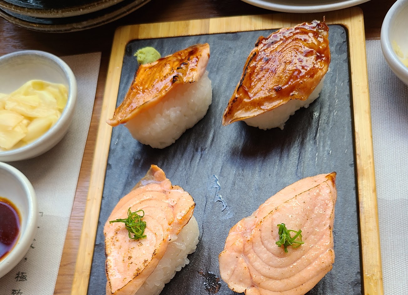 2.單點炙燒鮭魚比六貫的好吃,可能六貫準備時間較長 導致其他炙燒壽司的溫度涼掉,醬燒的相對比較膩口。