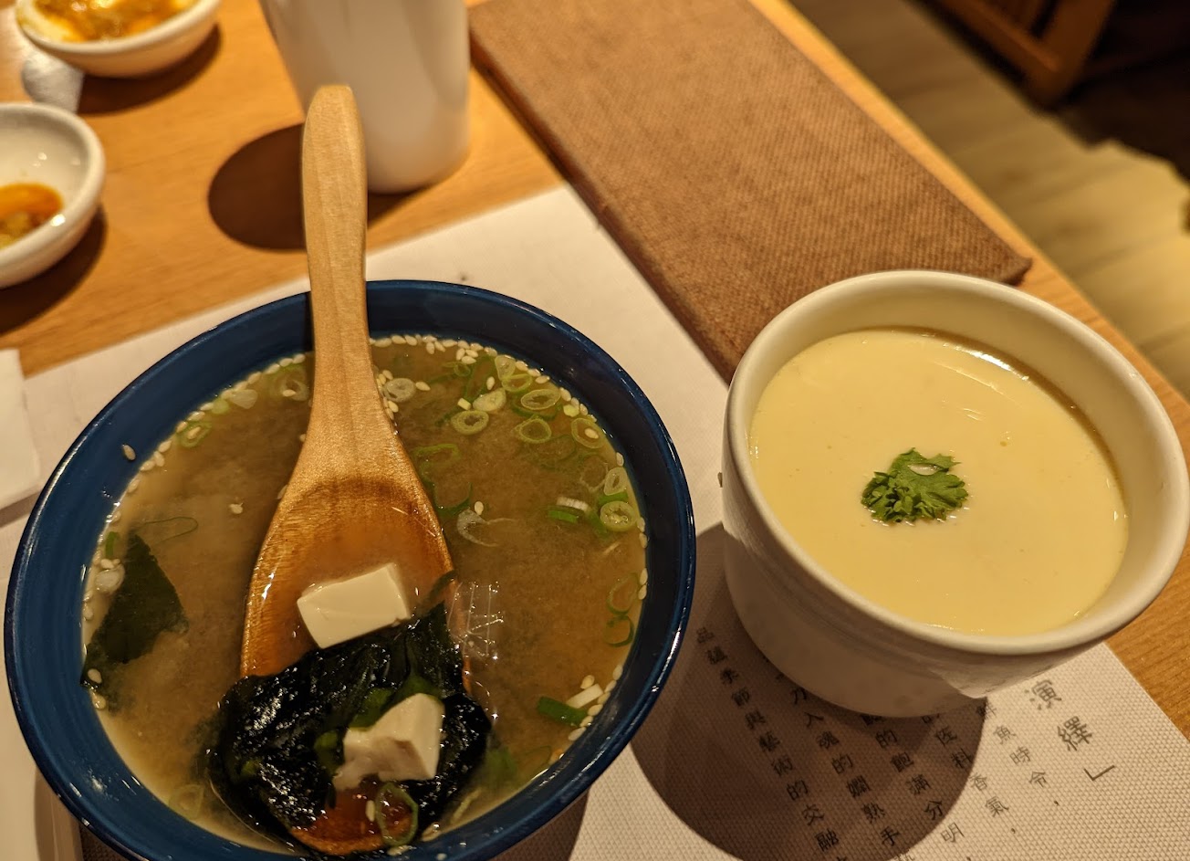 有一個炸蝦手卷搭配味增湯跟茶碗蒸的組合