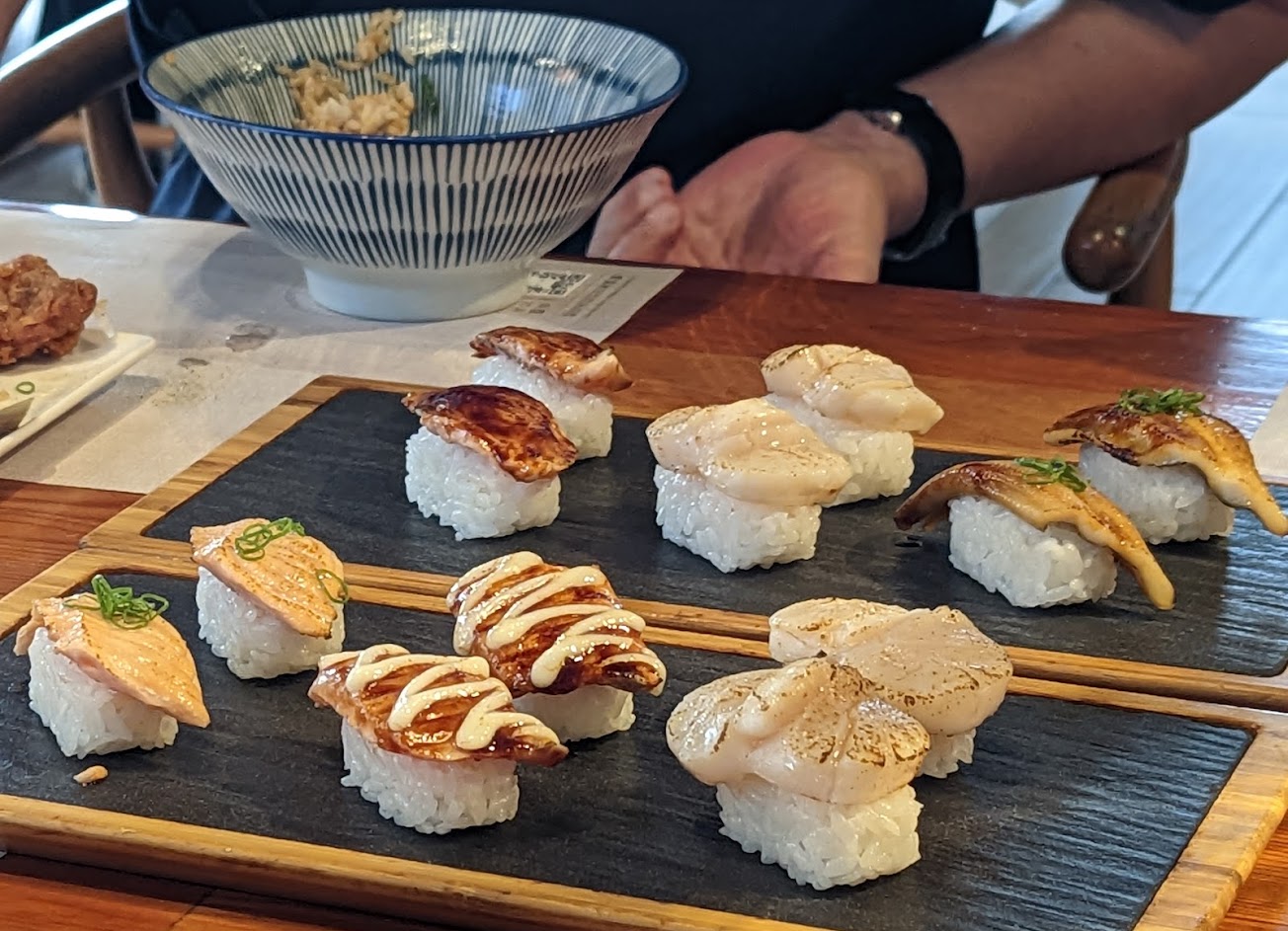 不吃生魚片的我,點了炙燒干貝握壽司、炙鮭組合、炸蝦鮭魚卷、紫米紅豆粥,都沒讓人失望~~好吃😋